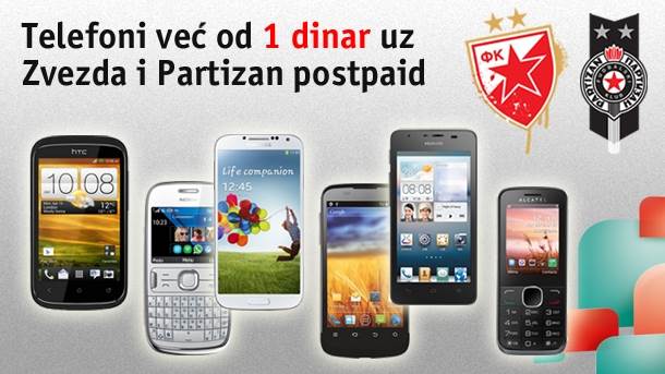 Uz Zvezda postpaid ili Partizan postpaid tarife možete se opredeliti za neki od atraktivnih telefona iz naše ponude: Samsung Galaxy S4, Huawei G 510, HTC Desire C, ZTE Blade 3, Nokia 302 ili Alcatel 2005D po ceni već od 1 dinar. Promotivne povoljnosti važe uz ugovor na 24 meseca.