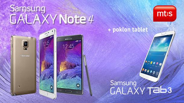 Samsung Galaxy Note 4 je vrhunski smart telefon koji će oduševiti sve koji vole telefone sa naprednim funkcijama i velikim ekranom. Kako bi obradovali svoje sadašnje i buduće korisnike, mt:s je omogućio da prvih 50 korisnika koji rezervišu ovaj novi telefon iz Galaxy Note serije u nekoj od poslovnica, putem webshop-a ili pozivanjem Kontakt centra na broj 19818 dobiju na poklon tablet Samsung Galaxy Tab 3.