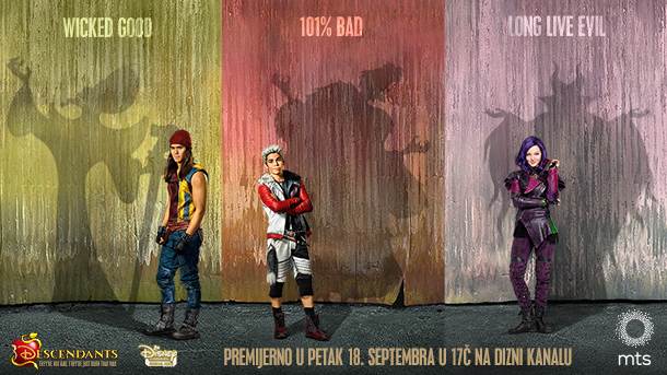 Na Disney kanalu, na mts TV-u (kanal 520), u petak 18. septembra u 17.00 časova očekuje nas premijera novog tinejdžerskog filma „Descendants”. Na neobičan način za tradicionalne bajke, Diznijev film „Descendants” spaja dvorce sa učionicama stvarajući savremenu, muzičku priču o izazovima adolescenata koji se suočavaju sa očekivanjima roditelja i vršnjaka. Sa neočekivanim prikazima, zanimljivim zapletom i sa pomalo uvrnutim humorom, film se obraća i deci i odraslima podjednako zbog priče koja na razigran način predstavlja šta je moguće da se desi nakon „živeli su srećno do kraja života“.