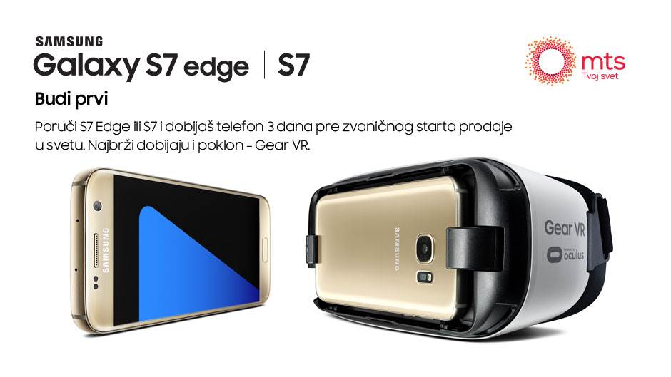 Samsung Galaxy S7 i S7 Edge su najnoviji telefoni renomirane južnokorejske kompanije Samsung, koja ne prestaje da iznenađuje unapređenjima telefona iz generacije u generaciju. Kako bi obradovao svoje sadašnje i buduće korisnike, mts je omogućio svim ljubiteljima Samsung uređaja da se prijave i naručeGalaxy S7 ili S7 Edgemobilni telefon koji će stići na kućnu adresu tri dana pre zvaničnog početka prodaje istih.