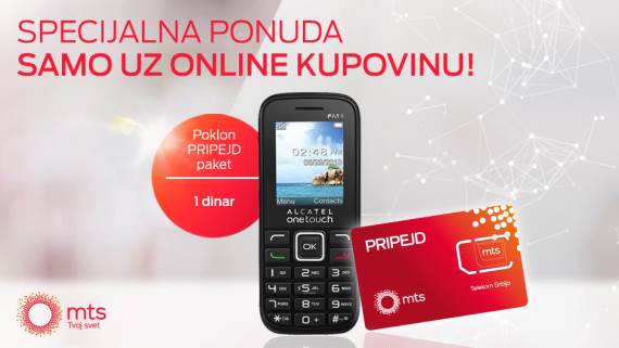 Kako bi obradovao nove i postojeće korisnike, mts je za sve korisnike koji se opredele za kupovinu u mts internet prodavnici pripremio specijalno iznenađenje - mts pripejd paketza samo 1 dinar, koji sadrži telefonAlcatel 1042di SIM karticu.