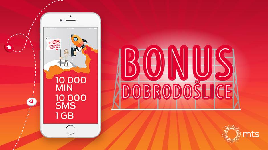 - 10.000 minuta u mts mreži, 10.000 SMS poruka u domaćem saobraćaju, 1 GB u domaćem saobraćaju, u trajanju od 7 dana od dana aktivacije bonusa, a očekuju vas i dodatni bonusi od 1 GB u domaćem saobraćaju za svaku pripejd dopunu koju izvršite do kraja godine, ili