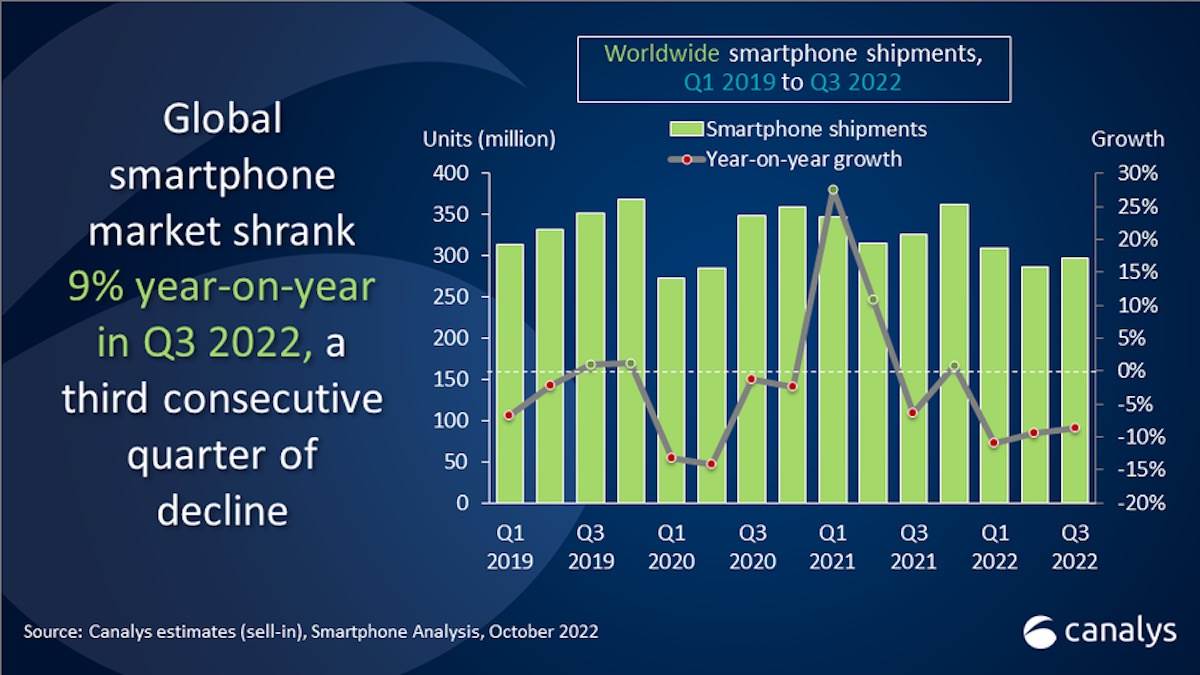 Prema istraživanju kompanije Canalys, prodaja pametnih telefona je već 9 meseci u konstantnom padu, a pad od 9% u periodu jul-septembar 2022. predstavlja najgori treći kvartal od 2014. godine. Nestabilna ekonomska situacija u svetu je naterala potrošače da izbegavaju kupovinu prenosivih uređaja i fokusiraju svoje trošenje na esencijalne stvari, navodi se u istraživanju.