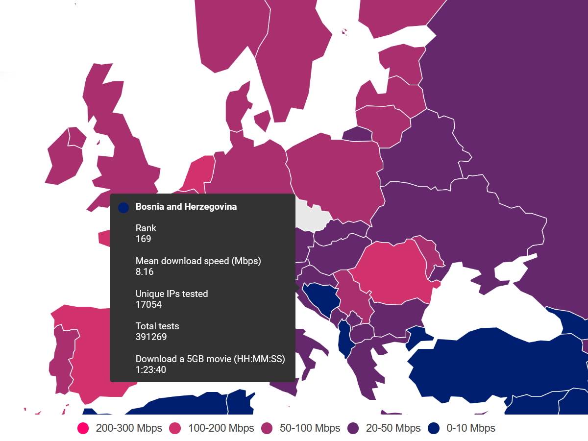 Na donjem kraju liste su Bosna i Hercegovina i Albanija kao zemlje s najsporijom internet brzinom, što se jasno vidi i na karti u našoj galeriji - prosečne brzine preuzimanja mogu pasti i ispod 20 megabita u sekundi. U BiH su brzine 8,16 Mb/s u proseku, što je na nivou 2017. godine kad je globalno merenje kable.co.uk kompanije u pitanju.