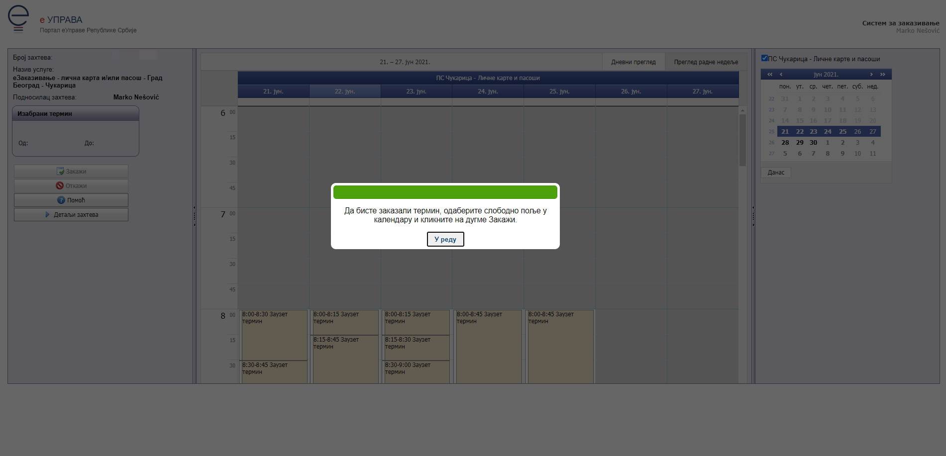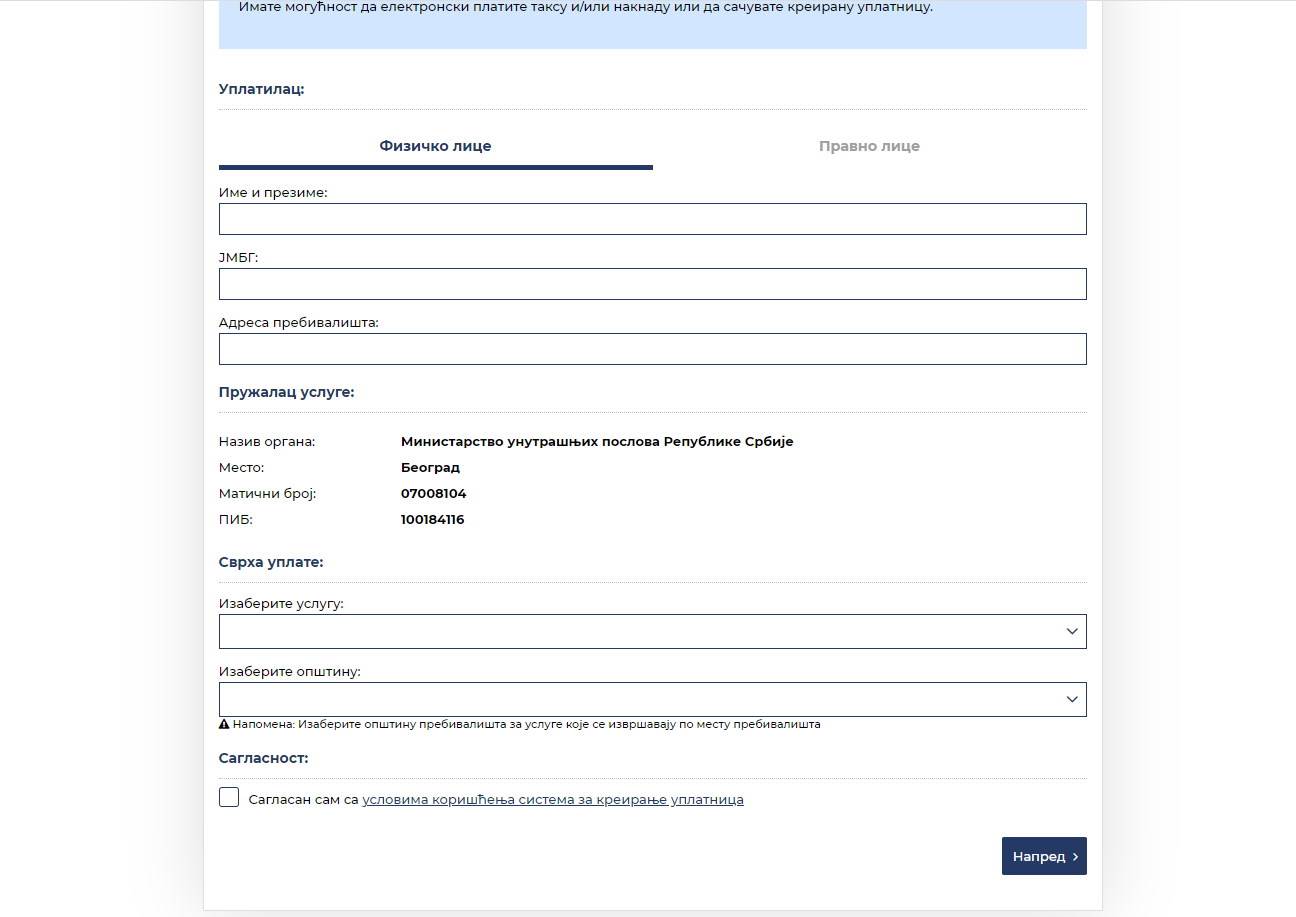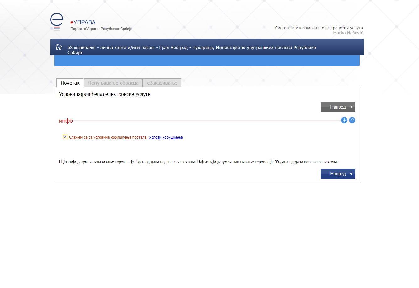 Takođe, tu su i informacije o potrebnim dokumentima i taksama koje treba da platite. Nakon toga potrebno je da prihvatite uslove korišćenja portala, proverite da li ste dobro uneli podatke i unesete dodatne podatke ukoliko želite da pored sebe zakažete termin i za nekog člana svoje porodice. Nakon toga ćete morati još jednom da proverite unete podatke i idete na sledeći korak - zakazivanje termina.