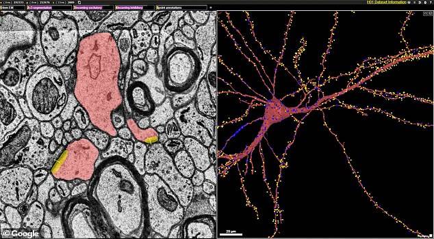 Mapa pokazuje kako se više od 4.000 aksona povezuju sa jednim neuronom, najosnovnijom ćelijom u nervnom sistemu, koja je zadužena za primanje senzornog unosa. Iako predstavlja samo jedan kubni milimetar moždanog tkiva, ovo je najveći uzorak moždanog tkiva koji je tako detaljno snimljen i rekonstruisan.