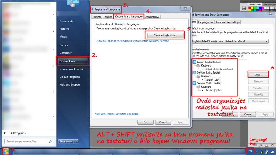 Ako vam na računaru još uvek nisu ubačeni jezici na tastaturi koji su vam potrebni, idite ovim redom i aktivirajte ih: Start - Control Panel - Region and Language. Kada se nađete u Region and Language meniju otvorite karticu (tab) Keyboards and Languages i kliknite na opciju Change Keyboards. Otvara se novi prozor u kojem imate mogućnost da dodate nove jezike i da izvršite njihov raspored.
