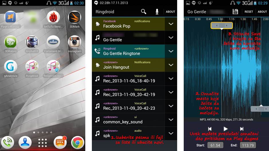 Kada Ringdroid otvori odabranu pesmu dovoljno je pomeriti levi klizač, koji će biti početno mesto melodije i podesiti i desni klizač, gde će se označiti kraj melodije. Preslušajte melodiju u celosti ili samo označeni deo kada god to poželite pritiskom na Play taster. Kada ste zadovoljni melodijom stisnite ikonicu diskete, odnosno Save i to je to. Melodija je već spremna!