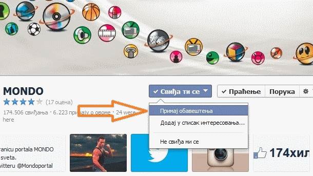 Ako ne želite da propustite najnovije i najzanimljivije vesti MONDO portala i da o tome budete obavešteni putem Facebooka sve što treba da uradite je da na MONDO Facebook strani pored dugmeta "sviđa ti se" štiklirate opciju "primaj obaveštenja", odnosno ako koristite ovu društvenu mrežu na "Get Notifications".