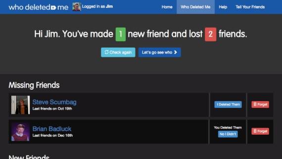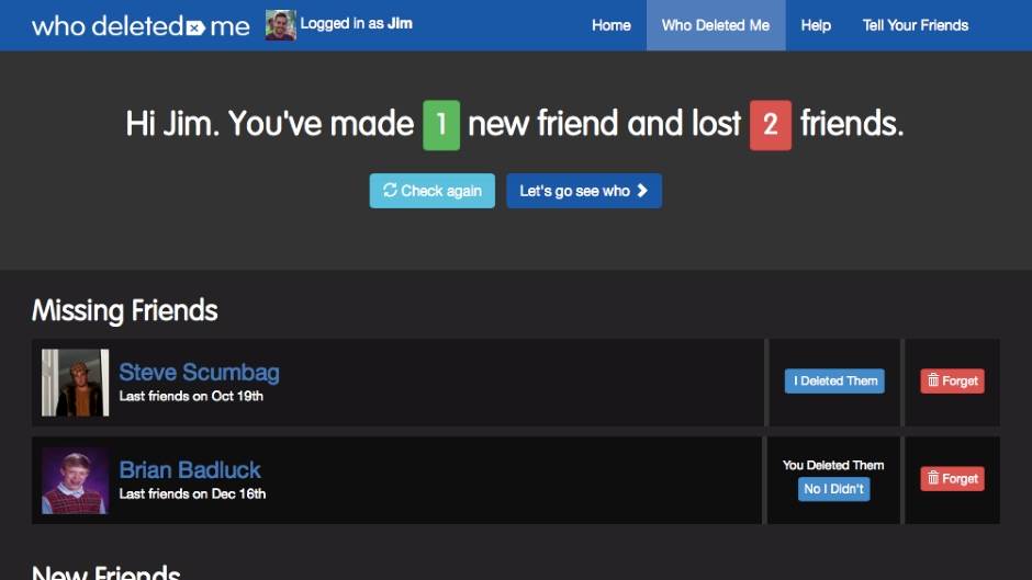 Uostalom, zar nije to što ti je oduvek falilo?! Da znaš baš tako nešto. Ako jeste, za tebe je upravo Who Deleted Me opcija. I mora da se koristi duže vreme, da znaš. Princip rada je jednostavan - Who Deleted Me Chrome ekstenzija, recimo, češlja tvoju listu prijatelja, upoređuje je svakodnevno i na osnovu razlika koje nastanu između dva „češljanja“ izbacuje listu onih koji su ti postali prijatelji i onih koji su te otkačili - žao nam je, zaista, što ti se tako nešto dogodilo, ali nije to ništa strašno!