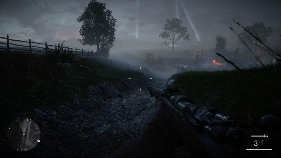 Šunjao sam se zapadnom stranom kako bih pokušao da zaobiđem glavne patrole i došunjao se do prvog čekpointa. Lišće i žbunje su mi bili dobar saveznik jer su me krili u polumračnoj, maglovitoj močvari smrti. Popeo sam se na brežuljak sa kog sam imao dovoljan pregled nemačkog čekpointa i strpljivo i pažljivo sam markirao neprijatelja. Proveo sam tu neko vreme markirajući patrole, proveravajući naoružanje, topove i računajući najbolji pristup kako da napravim distrakciju.