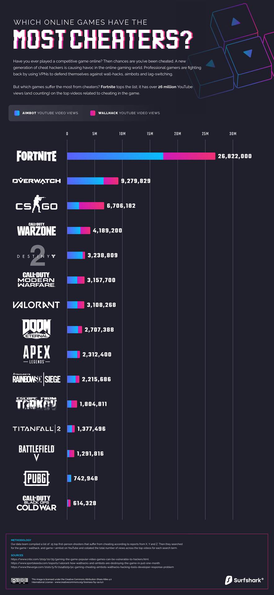 Kompanija Surfshark je otkrila zanimljive podatke kada su u pitanju gejmeri koji varaju. Podaci prikupljeni sa Google i YouTube platformi ističu da Fortnite vodi kolo čitera, više od 26.000.000 pregleda imaju klipovi vezani za varanje, što je tri puta više nego sledeća igra na listi. Top 5 čine i ovi naslovi, Overwatch, Counter-Strike, Call of Duty: Warzone i Destiny 2.