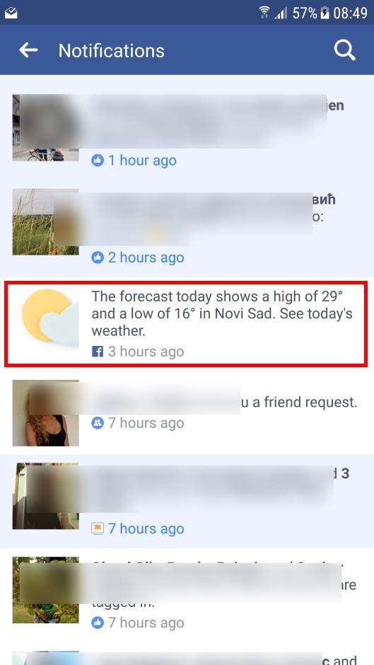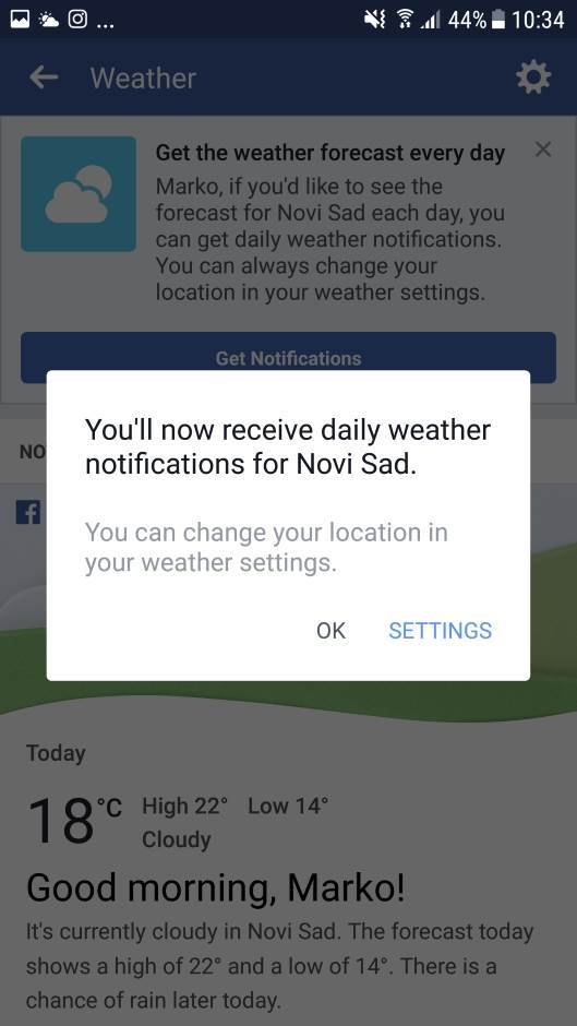 Facebook vremenska prognoza je na zahtev dostupna i u Srbiji i možete je aktivirati iz Settings menija, nakon čega će vam se kroz notifikacije dostavljati svakog jutra.