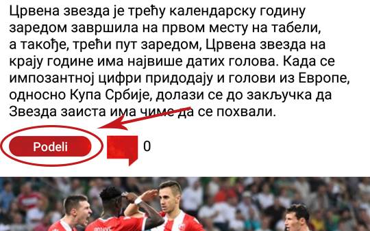 Da biste lako podelili sjajne vesti i sa drugima, omogućeno je vrlo jednostavno deljenje vesti putem svih društvenih mreža i ostalih aplikacija na vašem telefonu, klikom na dugme „Podeli“.