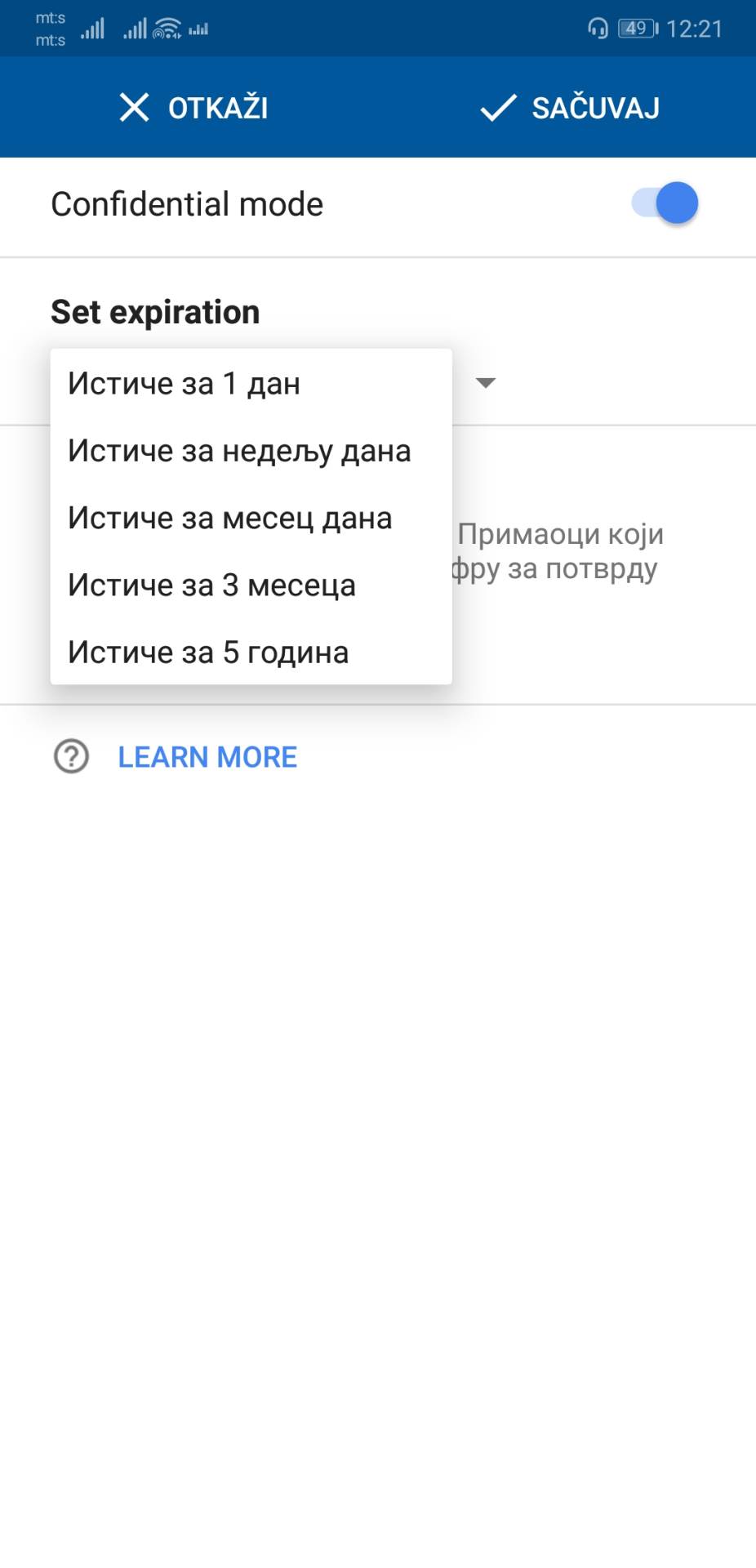 Poverljiv mod aktivira se prilikom pisanja nove poruke, klikom na tri tačke gore desno i odabirom “Poverljiv režim“ opcije. Nakon toga omogućen je izbor podešavanja isticanja tj. trajanja poruke (od jednog dana do pet godina) i postavljanje lozinke - SMS porukom ili na neki drugi način. Ova opcija funkcioniše i ukoliko korisnik, kojem se šalje mejl ne koristi Google GMail.