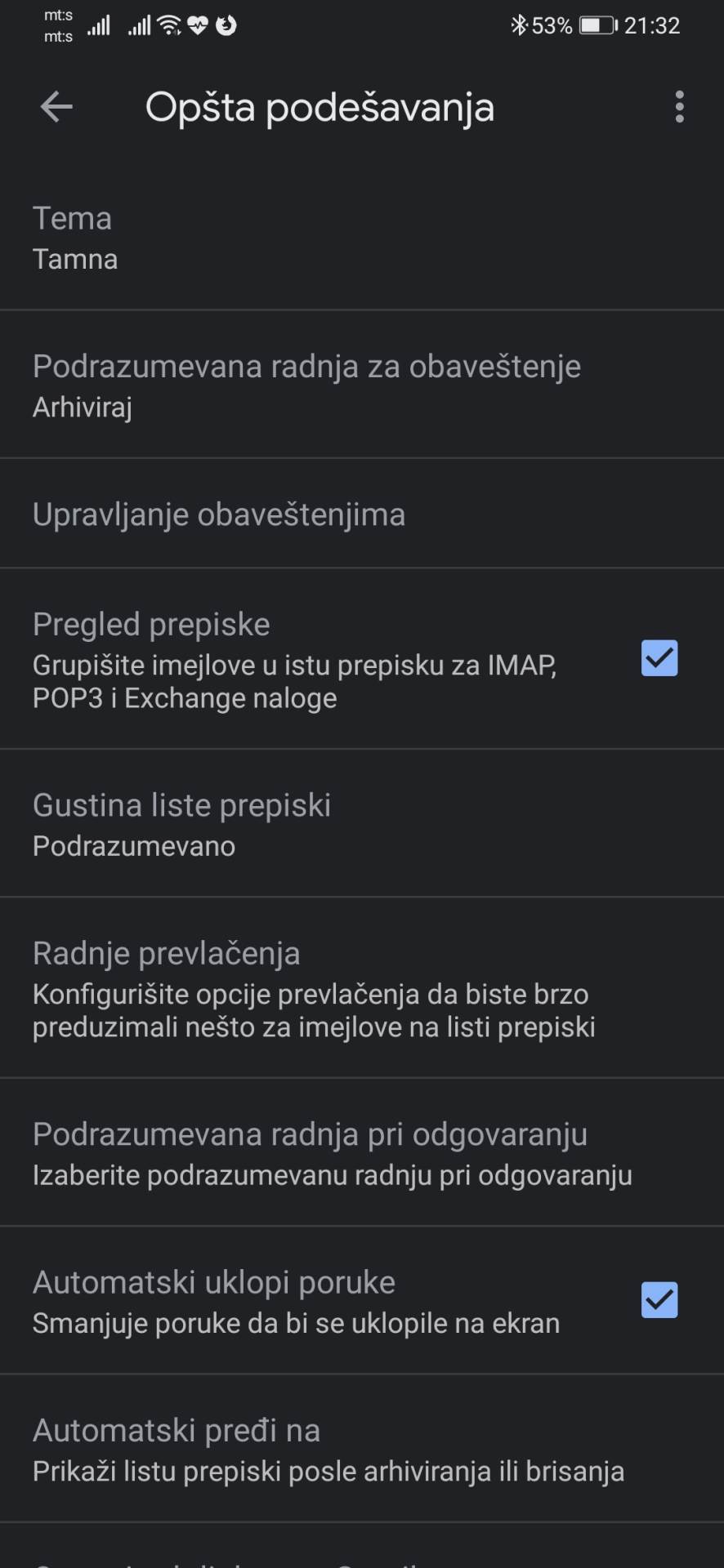 GMail u tamnoj boji izgleda odlično, beli tekst na crnoj pozadini je vrlo dobro čitljiv, a oznake mejlova, kakve su prioriteti, dodaci i druge se jasnije vide, jer je žuta ili crvena boja mnogo izraženija na tamnoj pozadini.