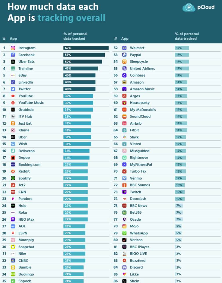 Drugo mesto je zauzeo Facebook koji predaje 57% podataka, a prate ih LinkedIn i Uber Eats sa tačno 50%. Uzmite u obzir da aplikacije prikupljaju podatke iz mnogo razloga, jedan od glavnih je kako bi vaš doživljaj učinili još boljim, zbog čega i prate šta radite. Ipak, oni koriste te podatke kako bi vas ciljali i sa reklamama na bilo kojoj platformi. Možda ste primetili da kada završite sa jednom aplikacijom, na drugoj se pojavi reklama toga što ste upravo gledali.