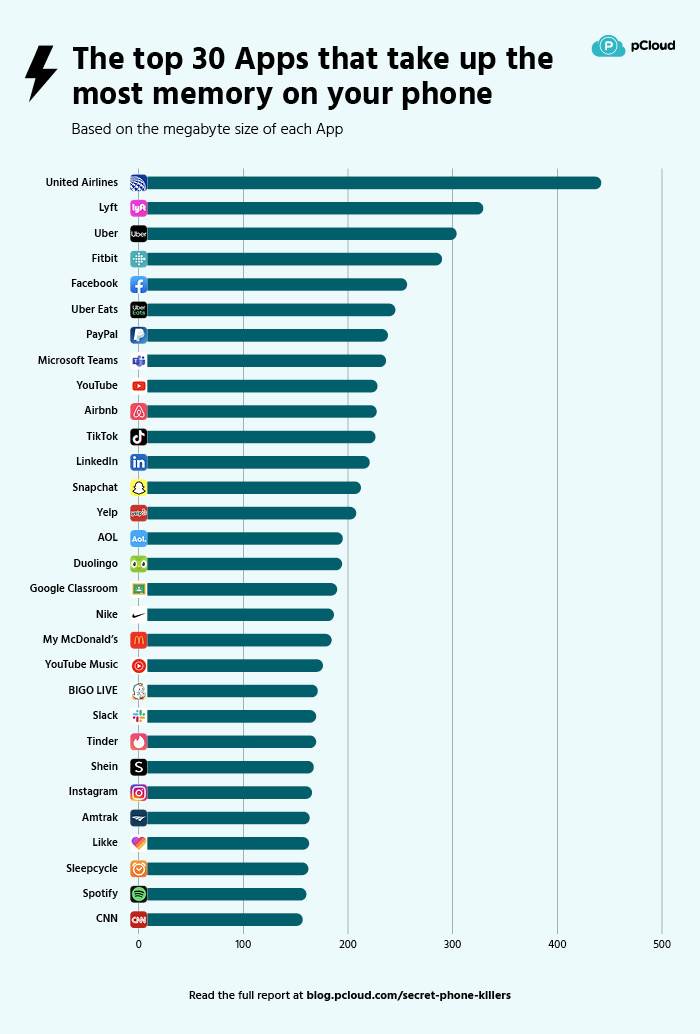Prosečan telefon poseduje 64 gigabajta interne memorije, dok operativni sistem zauzima oko 10 gigabajta. Oni su izračunali koja od ovih 100 aplikacija najviše zauzima prostora. Njihovo istraživanje je pokazalo da aplikacije za transport ili putovanja najviše zauzimaju prostora, kako prve tri aplikacije nisu popularne u našem regionu, nećemo nešto više pisati o njima. United Airlines zauzima 437 megabajta, 325 MB Lyft, Uber 299 MB.
