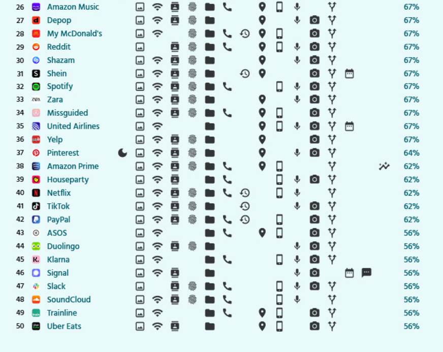Aplikacije kao što je Fitbit našla se na samom vrhu liste. Ova i kod nas dostupna aplikacija za sportske nosive pametne uređaje koristi 14 od 16 dostupnih dozvola (kamera, memorija, lokacija...) koje rade čak i u pozadini uređaja, uključujući i četiri najzahtevnije, kameru, lokaciju, mikrofon i Wi-Fi konekciju.