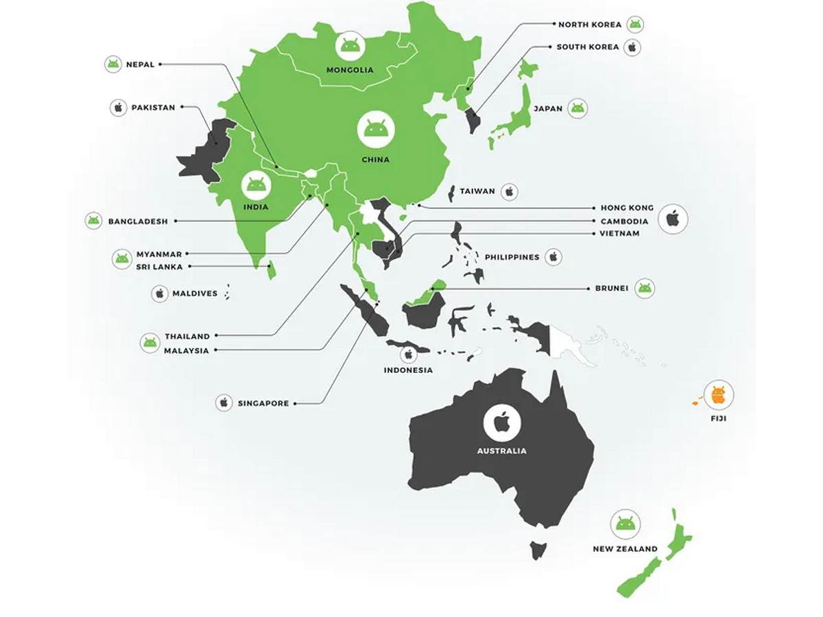 Dva diva azijske regije - Kina i Indija - listom biraju Android, a tako je i sa Japanom, što bi možda moglo biti i iznenađenje, kao i Novi Zeland, Tajland Malezija ili Bangladeš i Šrilanka. Australija je izabrala iOS, kao i Hongkong, Singapur, Kambodža i Vijetnam.