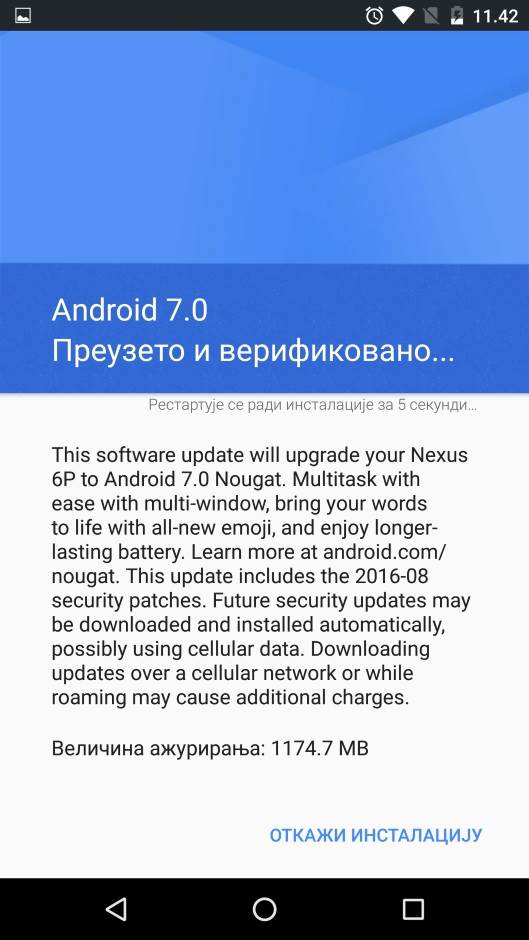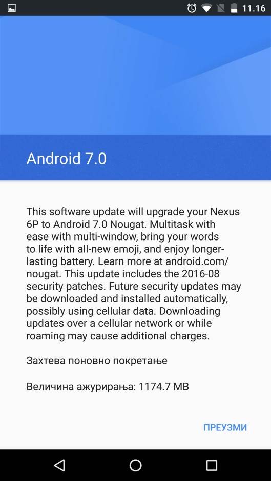 Ako je uređaj podržan za Android Beta program prikazaće se obaveštenje o prijemu Android Nougat 7.0 operativnog sistema. Pratite proceduru instalacije, ali prethodno se zakačite na brzu i kvalitetnu internet vezu putem Wi-Fi veze, jer je ažuriranje teško skoro 1.2 GB.