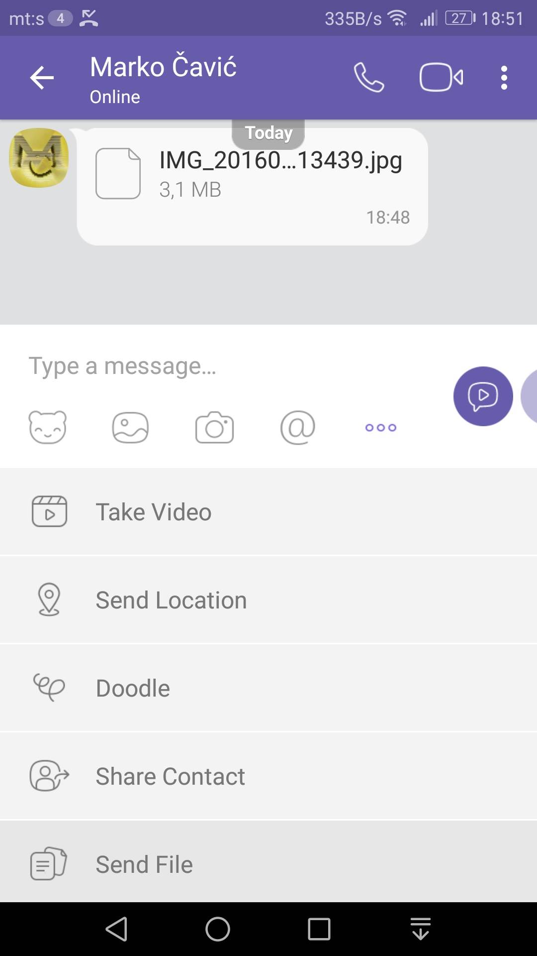 Ako je cilj da primalac vidi sliku pune rezolucije odaberite opciju „Send file“, pa odaberite sliku u „Viber File Browseru“ koji će se pojaviti. Nakon što sliku pošaljete na taj način primaocu će se pojaviti link za preuzimanje priloga sa pregledom imena slike i njene veličine (pogledajte galeriju slika koju smo napravili kao ilustraciju). Ipak, slanje slike na ovaj način neće je prikazati kao što je to slučaj sa direktnim slanjem iz galerije slike. Da biste videli sliku moraćete da uđete „u nju“, a potrošićete i nekoliko megabajta na njeno učitavanje.