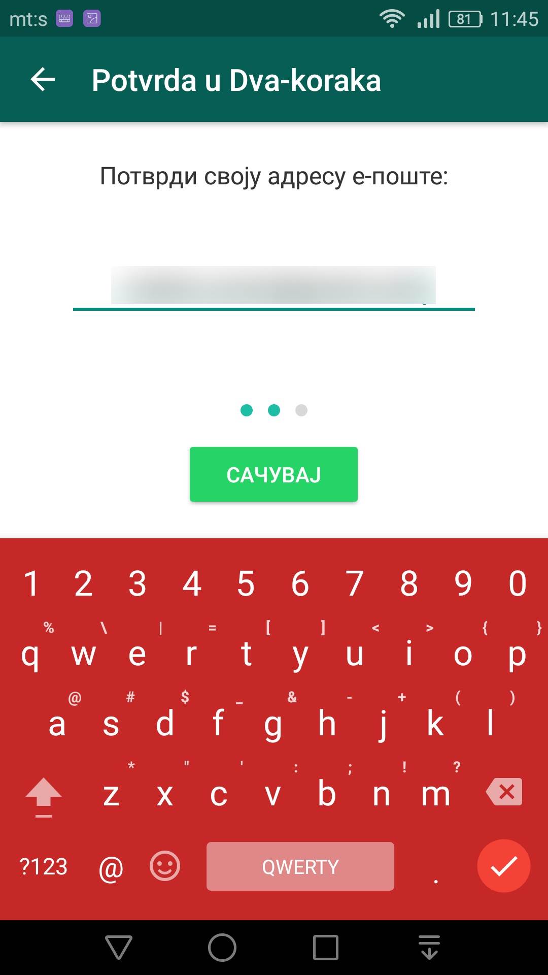 WhatsApp omogućava zaštitu naloga i aplikacije dodatnim šestocifrenim kodom, koji ćete ukucati svaki put kada registrujete broj telefona u WhatsApp aplikaciji nakon instalacije. Da biste bili sigurni da nećete zaboraviti kod (čak i da se tako nešto desi) na raspolaganju vam je mejl reset, za koji je potrebna (logično) validna mejl adresa (lična najbolje).