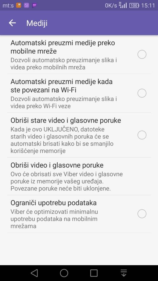 Da biste to uradili na Viber aplikaciji kliknite na tri crte, pa uđite u Podešavanja, odakle izaberite Medije i onda isključite opciju Automatski preuzmi medije preko mobilne mreže (kružić bi trebalo da bude prazan). Isto uradite i za opciju Automatski preuzmi medije kada ste povezani na Wi-Fi. Pogledajte galeriju slika u kojoj je objašnjeno korak po korak ovo o čemu smo upravo pisali.