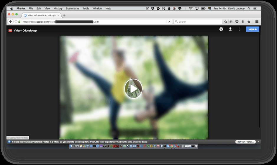 Link vodi do Google Doc fajla, koji je na nekim računarima u stanju da zakamuflira svoje maliciozne namere tako što preuzima izgled korisnikovog desktopa i prikazuje sadržaj koji može da se pusti kao video fajl. Nakon što korisnik klikne na „play“ dugme dobija informaciju kroz novi dijalog boks da bi trebalo da instalira „browser plugin“ kako bi pokrenuo video. Ako korisnik klikne na „Install“ napraviće veliku grešku, jer će omogućiti instalaciju ovog virusa, koji će kasnije prikazivati reklame, sakupljati i slati korisničke podatke, koristiti aktivnu internet vezu i u nekim slučajevima verovatno usporiti rad računara. U zavisnosti od toga na koji sistem se instalira virus je u stanju i da preuzme kontrolu nad računarom daljinskim putem.