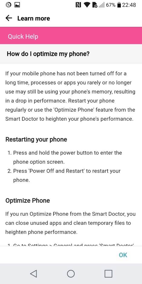 Recimo LG na svom najnovijem modelu, koji nam je upravo na testu - LG Q6, savetuje da se često vrši restartovanje uređaja, kako bi se on održao „svežim“ i „ornim“ za rad. LG kompanija, takođe, savetuje da se koriste fabrički ugrađene aplikacije za održavanje telefona u dobroj kondiciji (u ovom slučaju Smart Doctor), koji vrše optimizaciju rada uređaja.