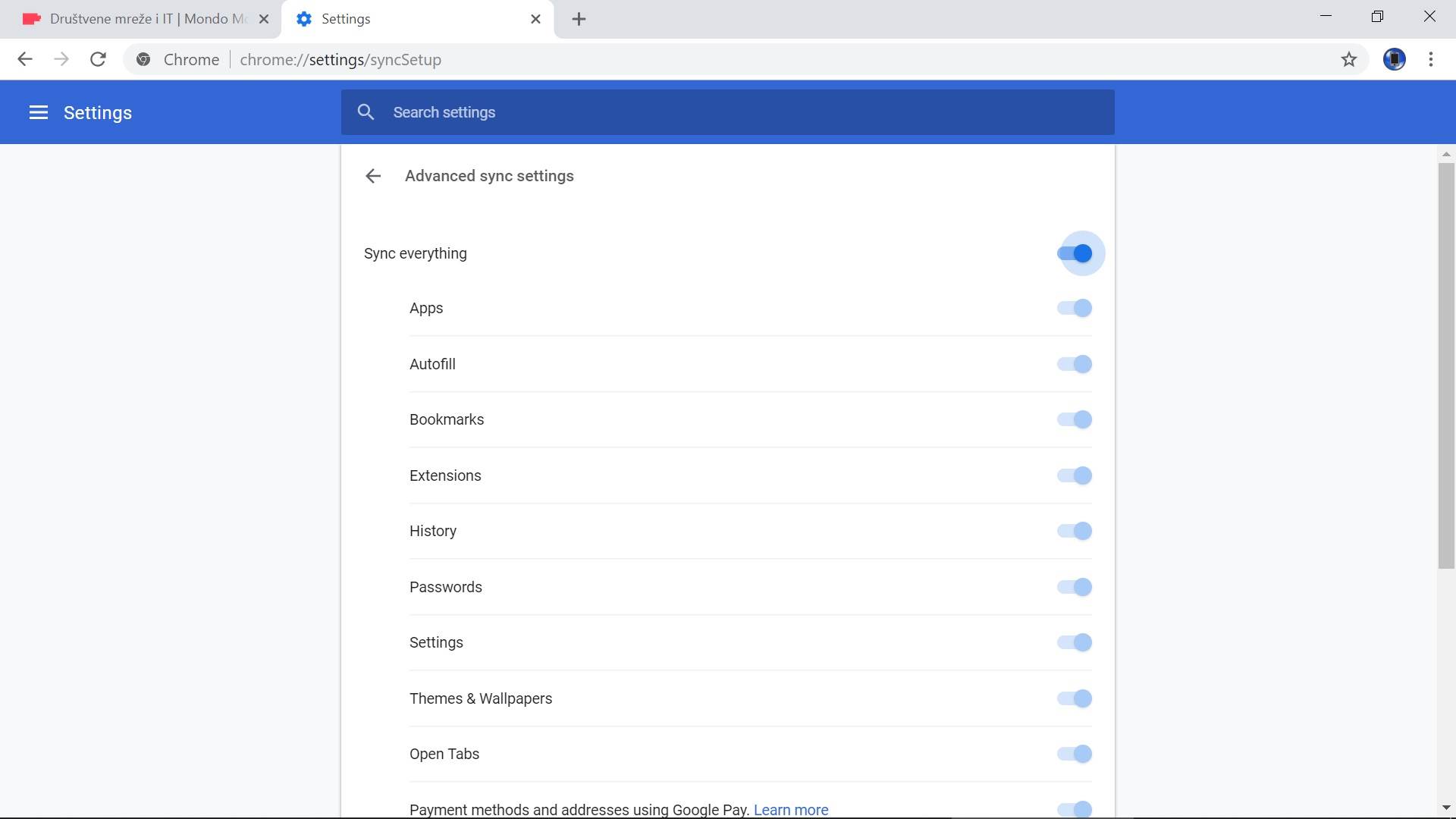 Za sada nije poznato kako da isključite ovu opciju, ali je dobro znati da bi Chrome “Sync“ opcija trebalo da bude isključena. Da biste to uradili pratite putanju kad otvorite Chrome na svom uređaju: tri tačke (gore desno) >Settings >Sync (odmah prva opcija) >Sync everything (isključite ili odaberite šta tačno želite tj. ne želite da šaljete u Google).