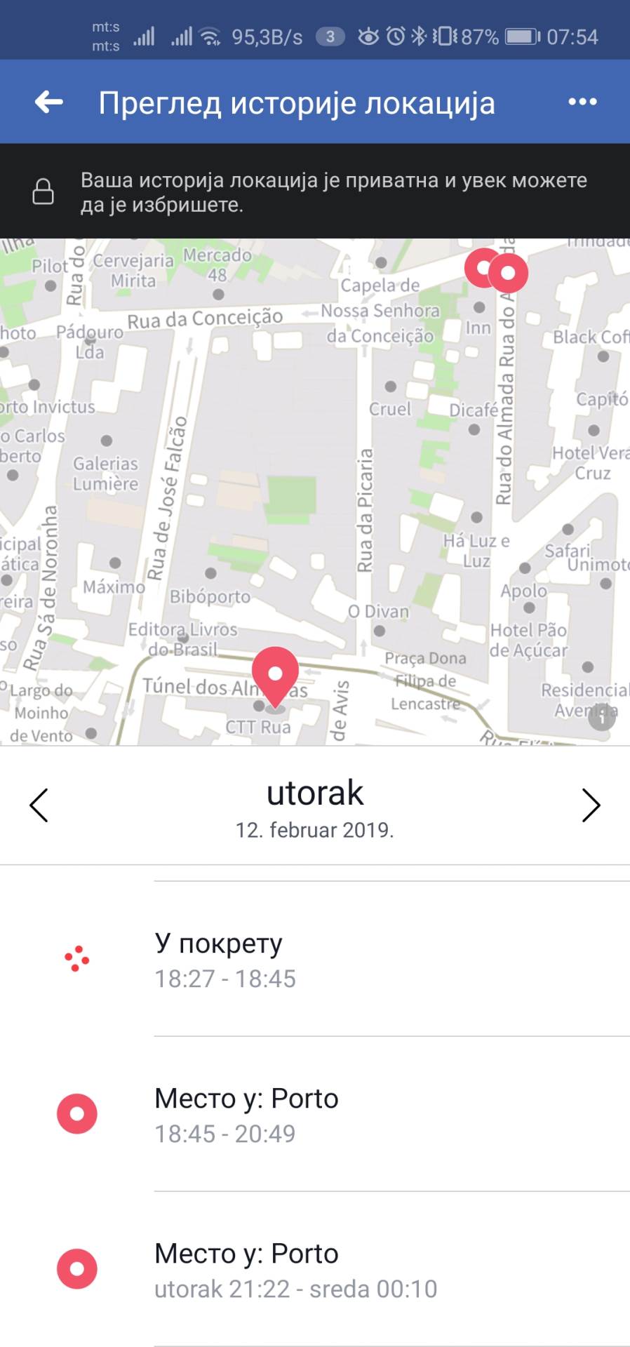 Da biste isključili Pozadinsko snimanje lokacije idite do tri linije u gornjem desnom uglu aplikacije i spustite se do Podešavanja i Privatnost opcije. Unutar nje odaberite Podešavanja, pa pronađite Lokacija odeljak, koji je pri dnu opcija. Kad uđete u taj meni isključite Istorija lokacija opciju, kao i opciju Pozadinsko lociranje. U okviru ovog menija imate priliku da pogledate ono što smo vam opisali - vremena i putanje kretanja sa neverovatnom preciznošću, uključujući da li ste se kretali pešice ili prevozom. Takođe, ove podatke možete da izbrišete iz svojih podataka u menijuPrivatnost.