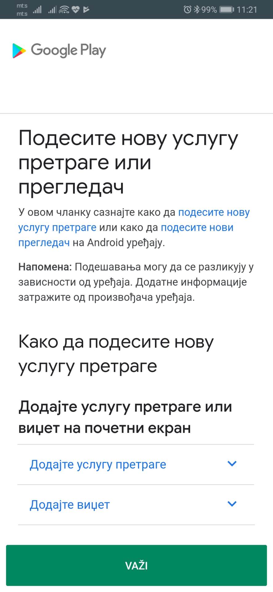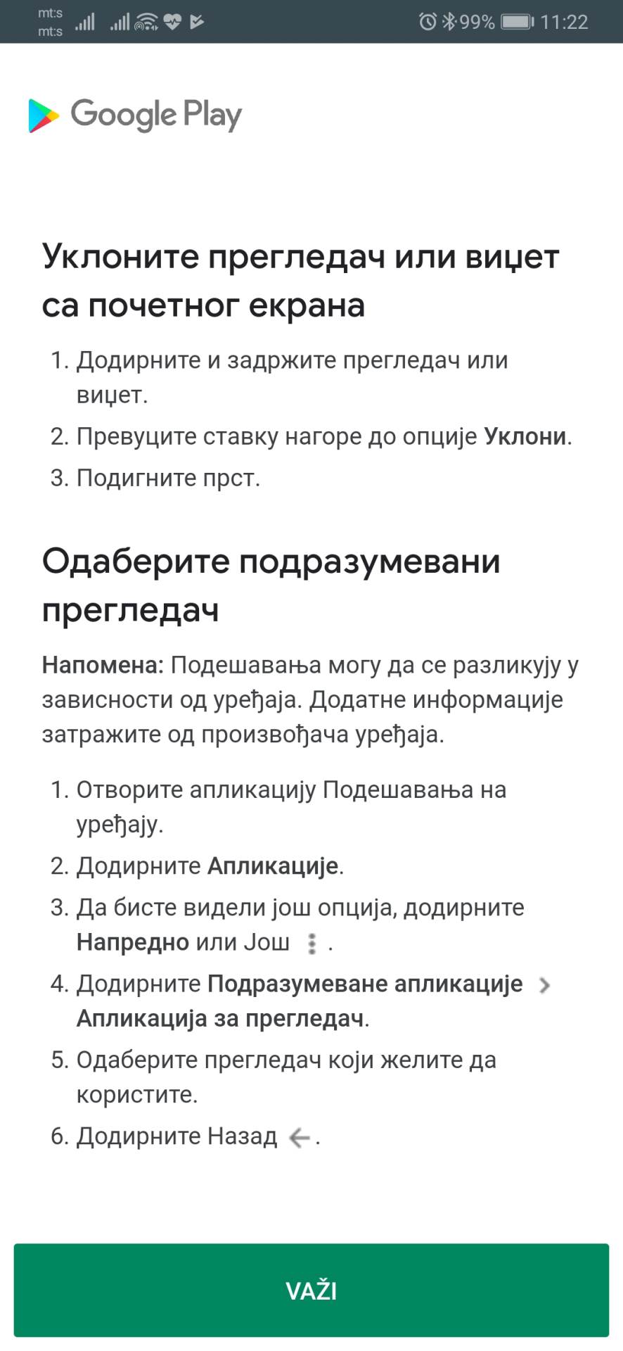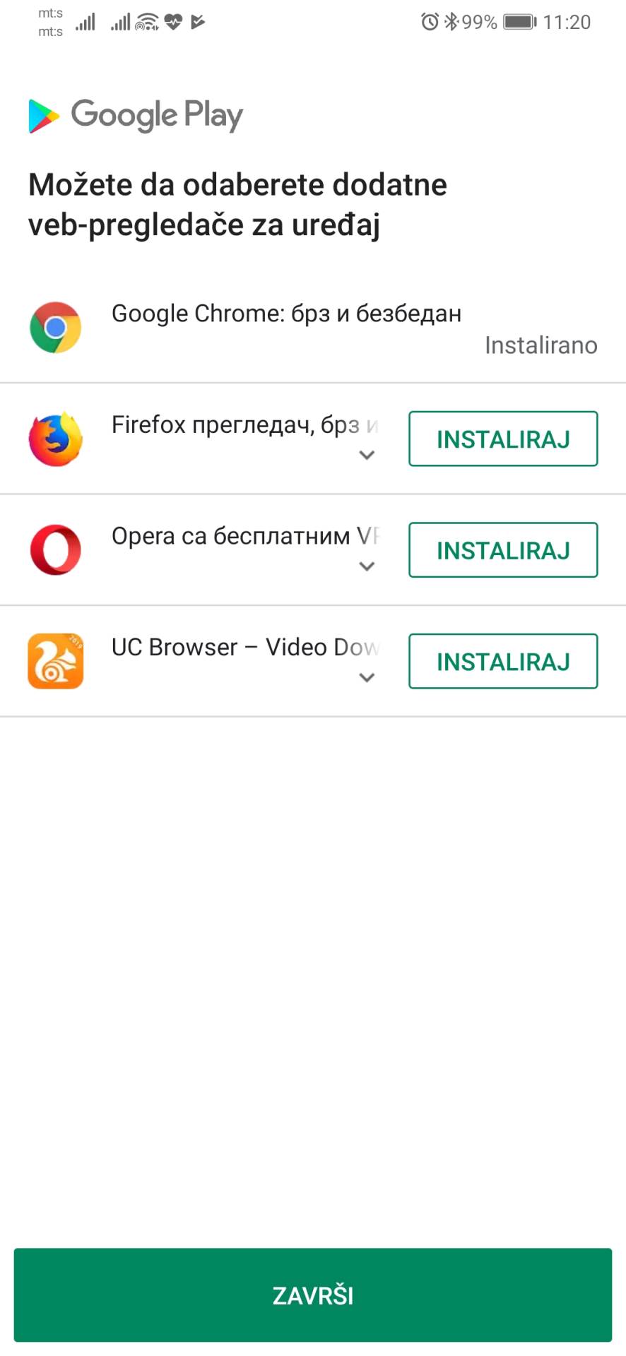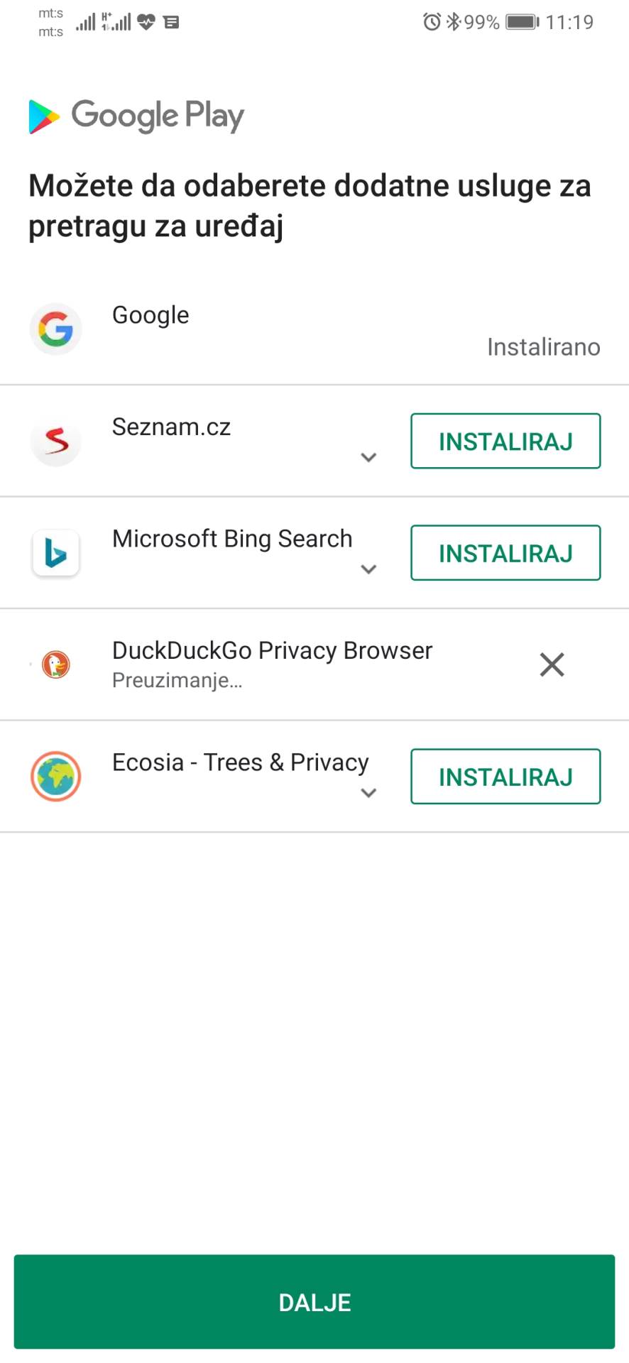 Prilikom pokretanja Play Store aplikacije od 20. juna ćete biti u prilici da izaberete drugi pregledač interneta i internet pretragu, umesto Chrome i Search aplikacija. U Srbiji je Google ponudi do četiri alternative, među kojima su Opera, Firefox i UC Browser za pregledanje interneta, kao i Bing, DuckDuckGo, Ecosia i Seznam za internet pretragu.