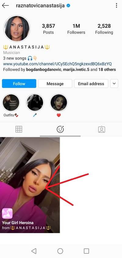 Upravo je Anastasija izbacila filter za društvenu mrežu Instagram pod nazivom "Your Girl Heroina". Uz pomoć njega možete da ulepšate vaše fotografije, to jest da suzite (smanjite) nos i povećate vaša usta! Ukoliko želite da instalirate ovaj filter, potrebno je da uđete na Instagram i uključite kameru, potom skrolujte skroz desno do opcije "Browse Effects", u pretrazi ukucajte Anastasija Ražnatović, kliknite na njen profil i videćete opciju da dodate filter. Svakako pogledajte našu galeriju za detaljnije instrukcije.