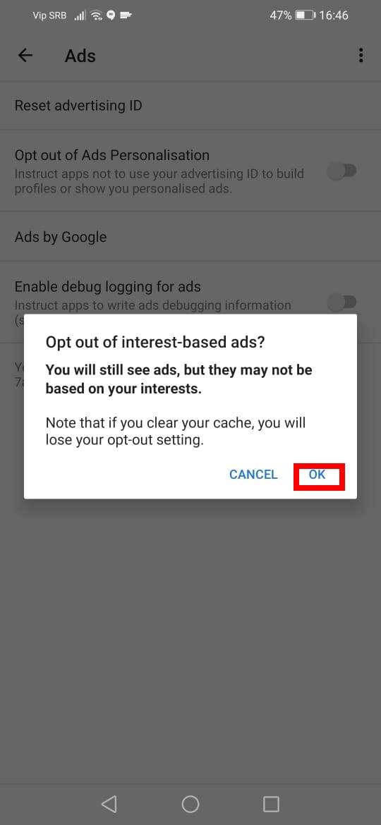 Postoji i opcija da potpuno izbrišete vaš identifikacion kod, kako biste dobijali drugačije personalizovane reklame. Ta opcija se zove Reset advertising ID,a nalazi se u istom prozoru kao i Opt out.