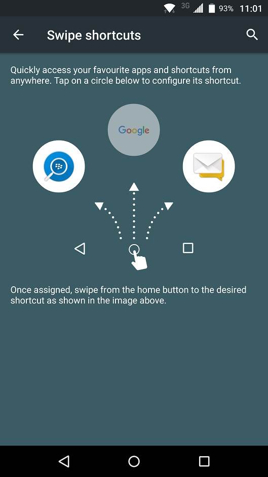 Swipe prečice pored Google Now prečice koje se “kriju” iza home tastera. Predefinisane su BlackBerry Device Search i BlackBerry Hub. Ali, možete ih zameniti nekim drugim. Ja sam ih zamenio AirDroid i SuperBeam aplikacijama kako bi mi opcije bežičnog prebacivanja fajlova bile dostupne u svakom trenutku.