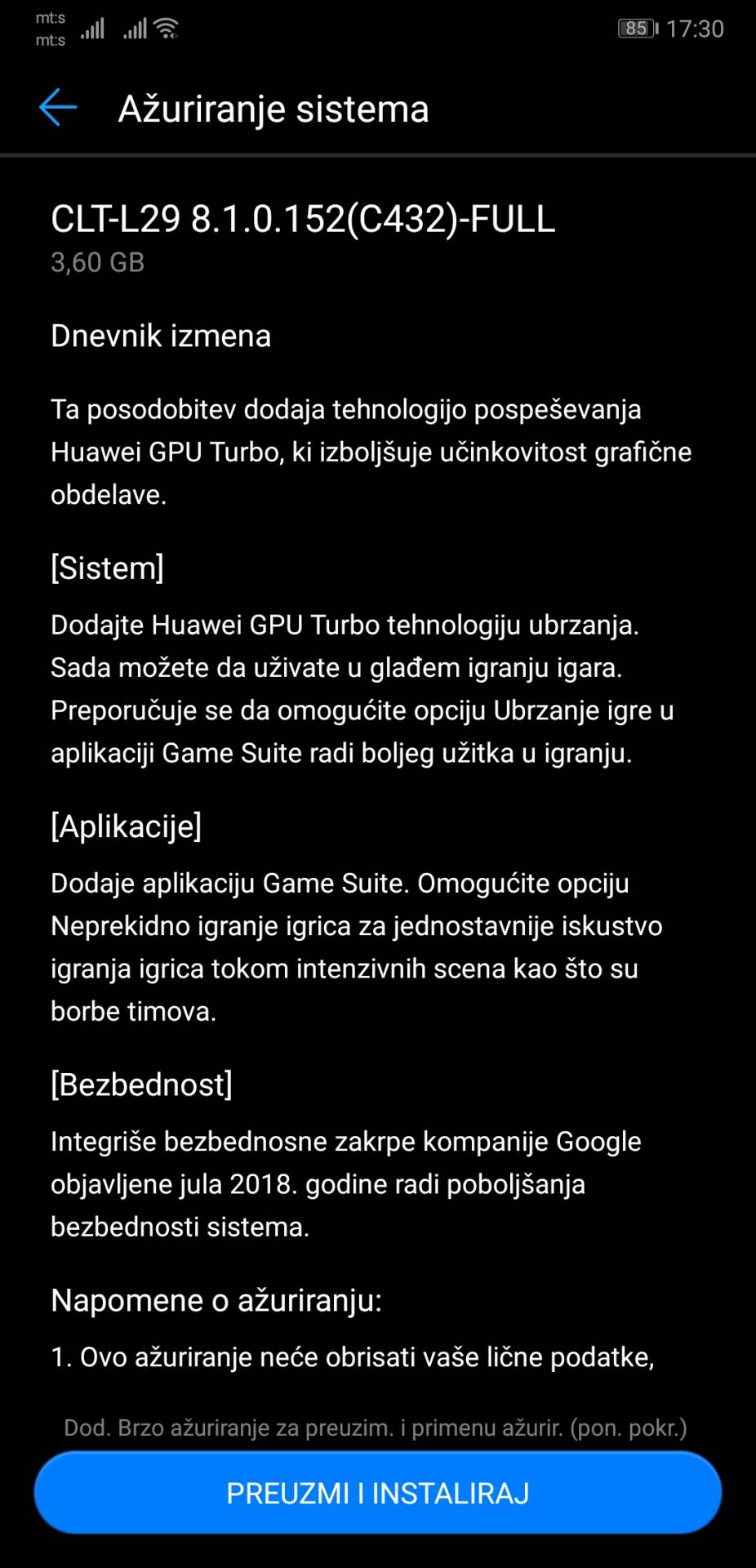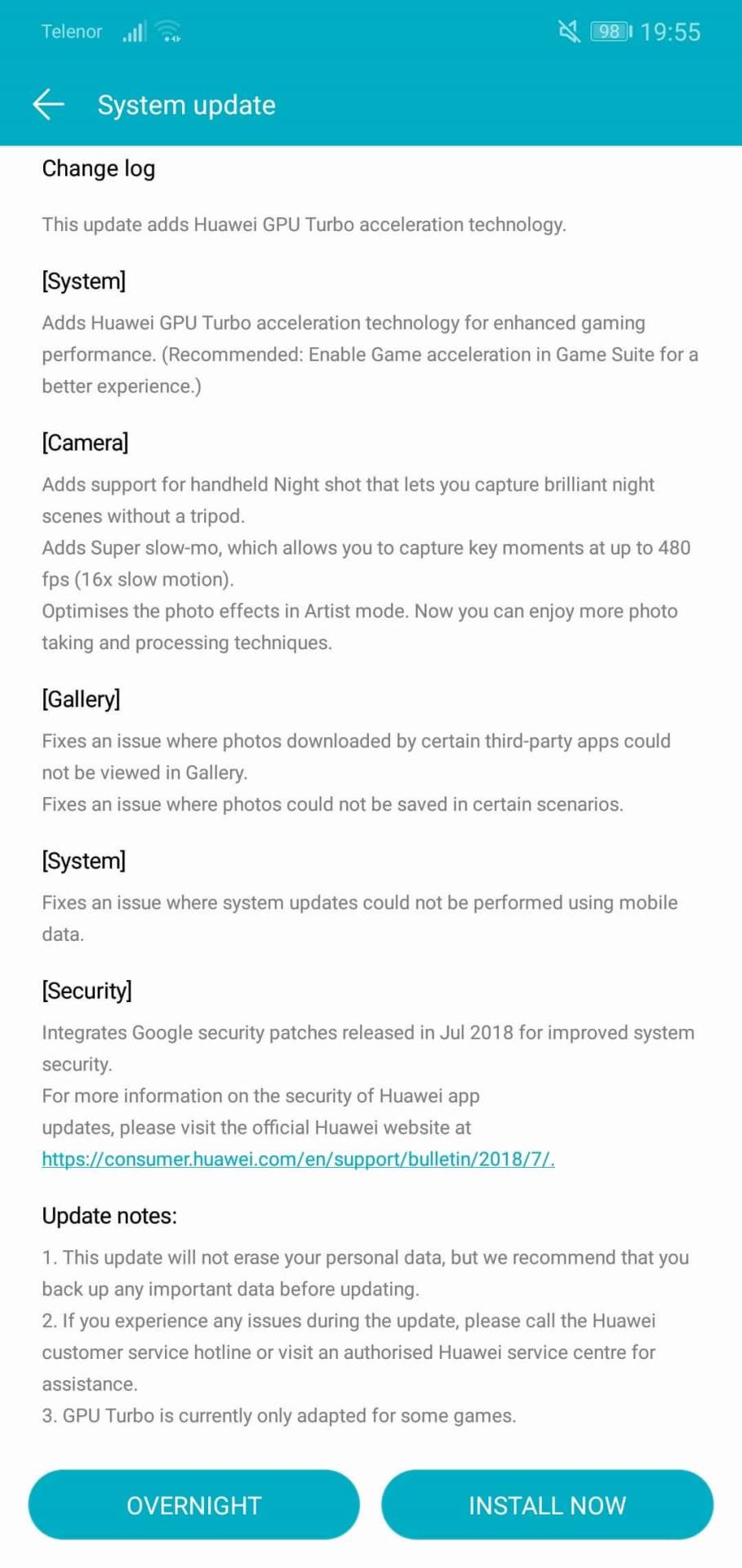 Honor 10 je prvi dobio GPU Turbo, početkom meseca, a na Huawei P20 Pro i pretpostavljamo i Huawei P20, GPU Turbo stigao je 14. avgusta. Veličina ažuriranja varira od 620 MB do 3.6 GB, u zavisnosti od toga koliko redovno ste ažurirali svoj uređaj. Ukoliko se odlučite da u Settings - System - Update - Download the newest whole package preuzmete potpuno nov ceo paket podataka svakako ćete dobiti najveću moguću datoteku, koja će sa ažuriranjem doneti i mnoga druga poboljšanja na telefone, ne samo GPU Turbo.
