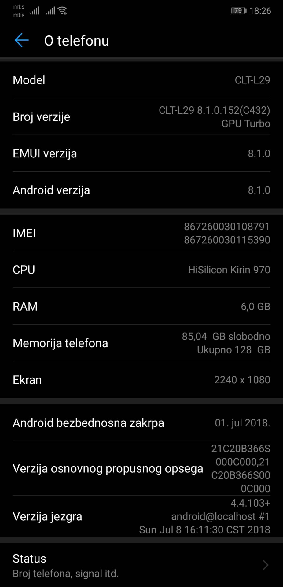 Oznaka novog softvera za Huawei P20 Pro je CLT-L29 8.1.0.152(C432) i ima dodatak GPU Turbo ispod oznake, kako biste bili sigurni da je nova funkcionalnost stigla na vaš uređaj. Za Honor uređaj je oznaka COL-L29 8.1.0.143(C432), ali za sada nema GPU Turbo u naznaci ispod broja softvera. Oba telefona rade na najnovijoj verziji Android Oreo 8.1 operativnom sistemu, ali i dalje imaju EMUI 8.1 (dostupan je već neko vreme EMUI 8.2).