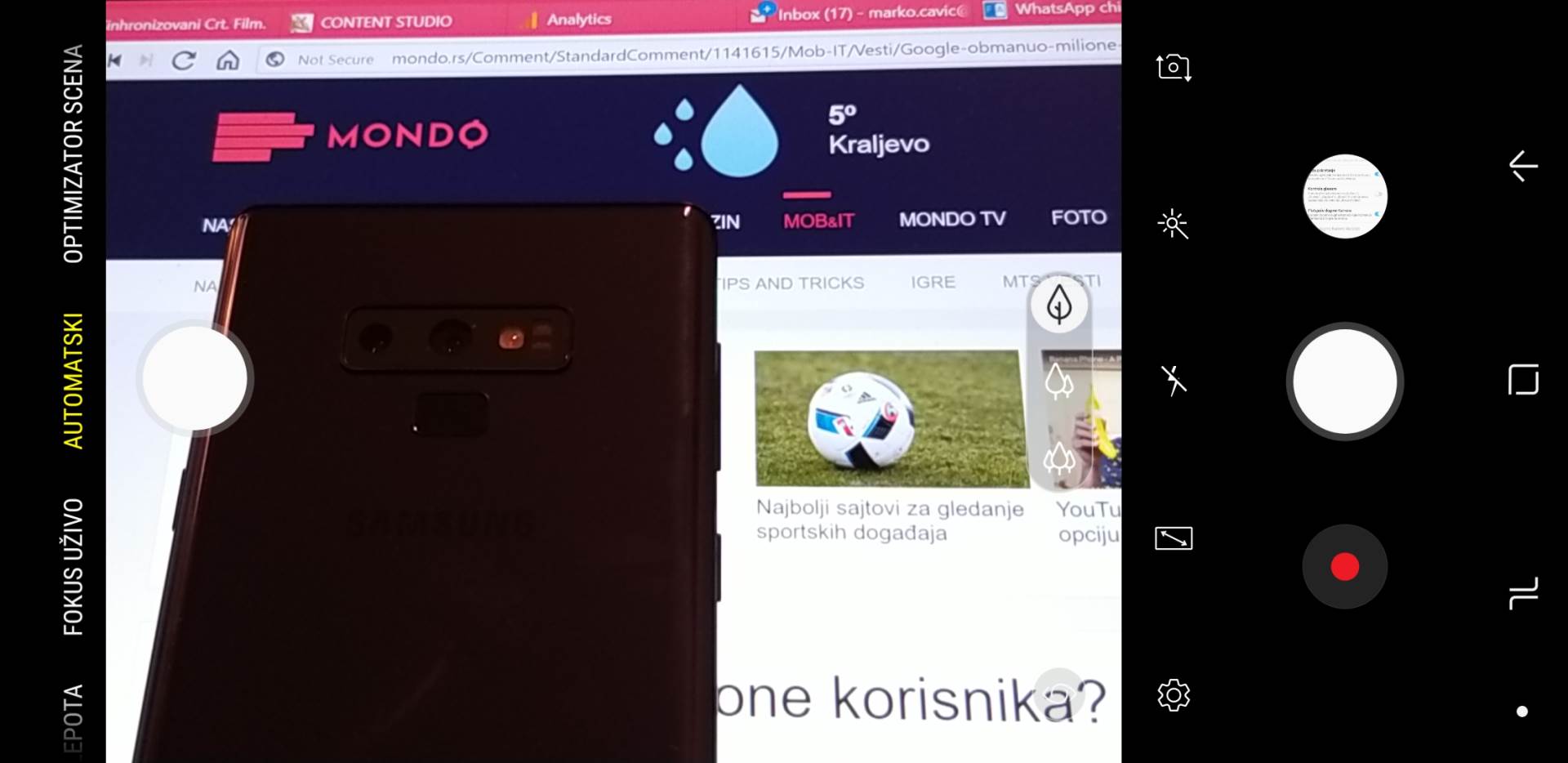 Još jedna zanimljiva opcija kamere je i plutajući okidač - više niste primorani da prilagođavate držanje telefona tasteru za okidanje slika na ekranu, rizikujući da vam telefon ispadne. Ne, uz Galaxy A9 napravite taster bilo gde na ekranu telefona, gde god vam je najzgodnije da čvrsto držite telefon i da istovremeno lako možete da okinete fotku ili započnete i zaustavite snimanje videa. Kameru možete najbrže da pokrete dvostrukim pritiskom na On/Off taster, a umesto tastera za okidanje čak možete da koristite glasovne komande za upravljanje kamerom. Takođe, zarad lakšeg korišćenja kamere - okidač s ekrana možete da pomerite na “Volume“ taster, ali se onda zumiranje kadra obavlja preko ekrana telefona.