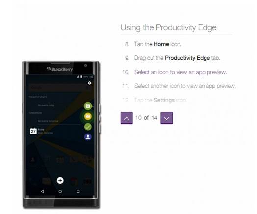Kao što je i očekivano, zakrivljeni ekran može da ima više namena. Kada punite telefon, možete videti status baterije u vidu linije na ivici ekrana. Ono što je još zanimljivije je BlackBerry Productivity Edge dodatak. Prstom prevucite od ivice ekana kako bi se prikazala kolona sa aplikacijama i kliknite na njih kako biste videli kratki prikaz onoga što se nalazi unutra. Pametan način za proveru vašeg rasporeda ili e-mail poruka otvaranja aplikacija.