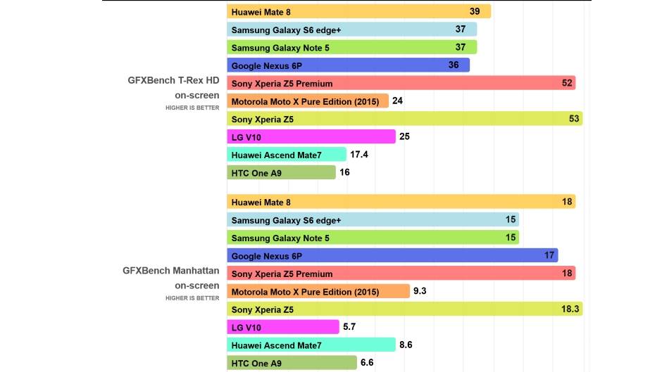 Huawei i konkurenti provučeni su kroz desetak najpoznatijih benchmark testova i Mate 8 je lagano završio na prvoj poziciji na kraju svakog testa. Tu su bili: AnTuTu, Vellamo Metal, Vellamo Browser, Sunspider, GFXBench T-Rex HD, GFXBench Manhattan, Basemark OS II, Geekbench 3 single-core i Geekbench 3 multi-core.