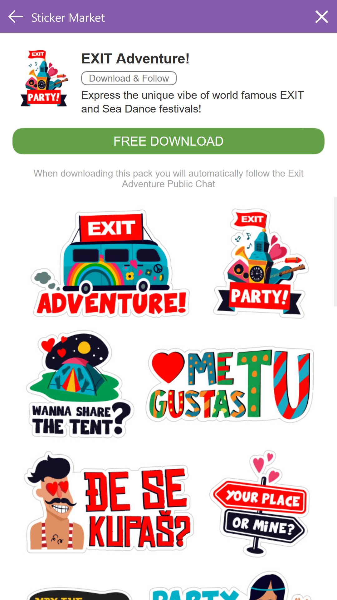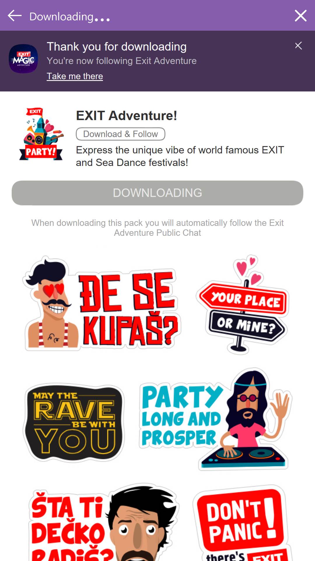 EXIT i Sea Dance su time postali prvi među vodećim svetskim festivalima koji imaju svoj paket stikera na Viber aplikaciji za Android, iOS, Windows 10 Mobile, Windows 10 i druge Windows sisteme, i milioni njegovih korisnika širom sveta će od sada moći da razmenjuju ovaj posebno zabavan i zanimljiv sadržaj tokom cele godine.