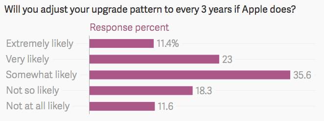 Sledeća zanimljivost u statistici jeste to što je tek oko 25 odsto ljudi vrlo zainteresovano da menja iPhone svaki put kad on bude redizajniran, što opet ne ide na ruku kompanije Apple. Ipak, veliki broj korisnika razmislio bi da menja iPhone na svake tri godine, ako Apple prilagodi svoj model prodaje i premijera na taj način.