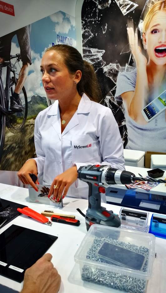 Na IFA 2016 sajmu u Berlinu sreli smo se i sa MyScreen rešenjem za zaštitu ekrana telefona od svake vrste ogrebotina. Dama koja radi u MyScreenLab postrojenju za testiranje izdržljivosti stakla upoznala nas je sa njihovim novim proizvodom, dijamantskim hibridnim staklom, koje je najčvršći i najizdržljiviji materijal za zaštitu ekrana bilo kog telefona.