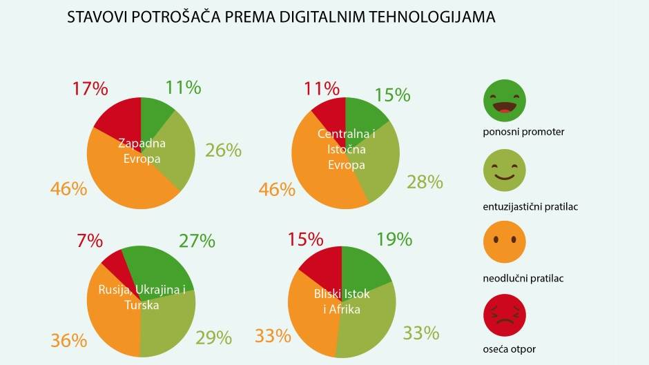 Ovim istraživanjem je obuhvaćeno 10 različitih zemalja Centralne i Istočne Evrope i ono pokazuje da je opšti stav prema digitalizaciji nešto pozitivniji u ovom regionu nego u Zapadnoj Evropi. Većina potrošača (preko 70 odsto) su zadovoljni digitalizacijom i imaju bolje mišljenje o uticaju inovacija na društvo od ispitanika u Zapadnoj Evropi. Ispitanici u Srbiji su pokazali visok stepen entuzijazma u pogledu digitalnih tehnologija - 89 odsto njih očekuje da će digitalne usluge igrati sve važniju ulogu u svakodnevnom životu, a 63 odsto navodi da inovacije ima pozitivan uticaj na društvo.