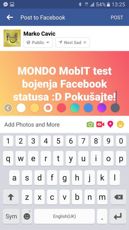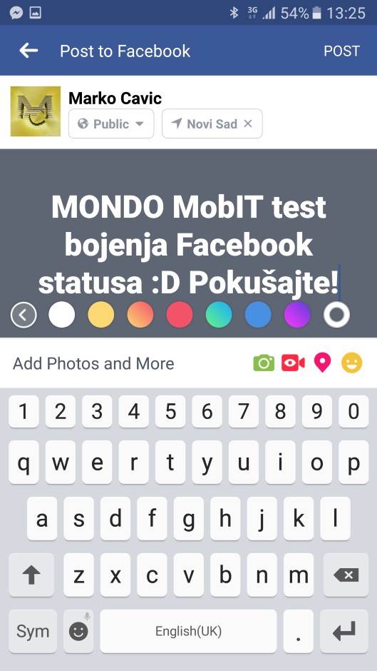 Prvi koji će dobiti priliku da iskoristi ovu šarenu opciju biće korisnici Android pametnih uređaja, a ubrzo nakon toga boje iza teksta statusa pojaviće se na desktop verziji kao i iOS-u. Korisnici Androida koji dobiju opciju "bojenja statusa" izbor različitih boja videće na dnu polja za unos teksta.