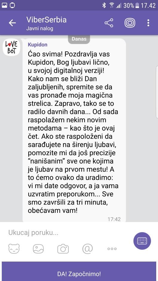 Kako je Viber Ljubavni bot već pobudio dosta interesovanja na javnom nalogu Viber Serbia moći ćete da pratite, lajkujete i podelite sadržaje zanimljive prepiske inspirisane ovim praznikom. Po izlasku na stranicu Viber Serbia javnog naloga na Viber aplikaciji, kliknite ikonicu za četovanje u gornjem desnom uglu, i Viber Ljubavni bot će vam se obratiti i predložiti da uradite Kupidonov ljubavni kviz.