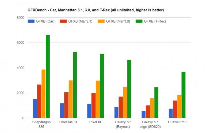 Grafika se pokazala najjačom u klasi, što je Qualcomm i obećao na premijeri, u merenjima GFXBench aplikacije. Snapdragon 835 lagano je pobedio sve konkurente. Adreno 540 čip je, očigledno, velika stvar u novom čipsetu.