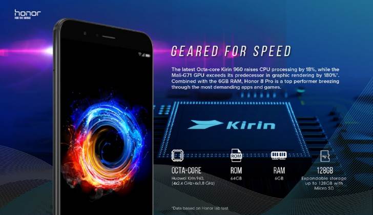 Honor 8 Pro ima dve kamere rezolucije 12 megapiksela sa HDR opcijom i unapređenim PRO i noćnim modom, blicem i mogućnošću snimanja 4K videa u do 30 fps. Sve ovo omogućava najnoviji Huawei Kirin 960 čipset, isti onaj koji imaju Mate 9 i Huawei P10. Ipak, uparen je sa 6 GB RAM i makar 64 GB interne memorije, koja se može proširiti microSD karticama. Iako ima Dual SIM podršku, bateriju kapaciteta 4.000 mAh, podršku za brzo punjenje i ekskluzivan metalno-stakleni dizajn, Honor 8 Pro debeo je svega sedam milimetara!