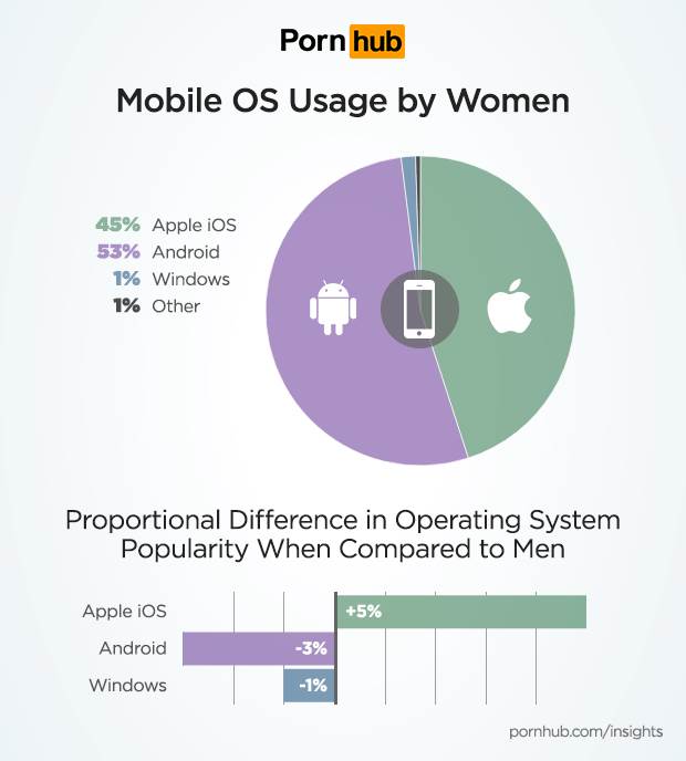 Od 72 odsto, koliko PornHub ostvaruje saobraćaja putem mobilnih telefona, žene su brojnija publika. Istraživanje je sproveo pomenuti sajt, tokom skoro tri godine i rezultati jasno pokazuju da je izvesnije da će 16 odsto više žena posetiti mobilne stranice s filmovima za odrasle, nego muškaraca, ali i da taj procenat raste s godinama.